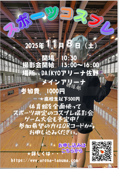 「スポーツコスプレ」11月8日(土) 13:00~16:00DAIKYOアリーナ佐野 メインアリーナスポーツ限定のコスプレを体育館を使って行います。バレーコート、バスケットコートももちろん準備しております!15時からはミニゲームも企画中